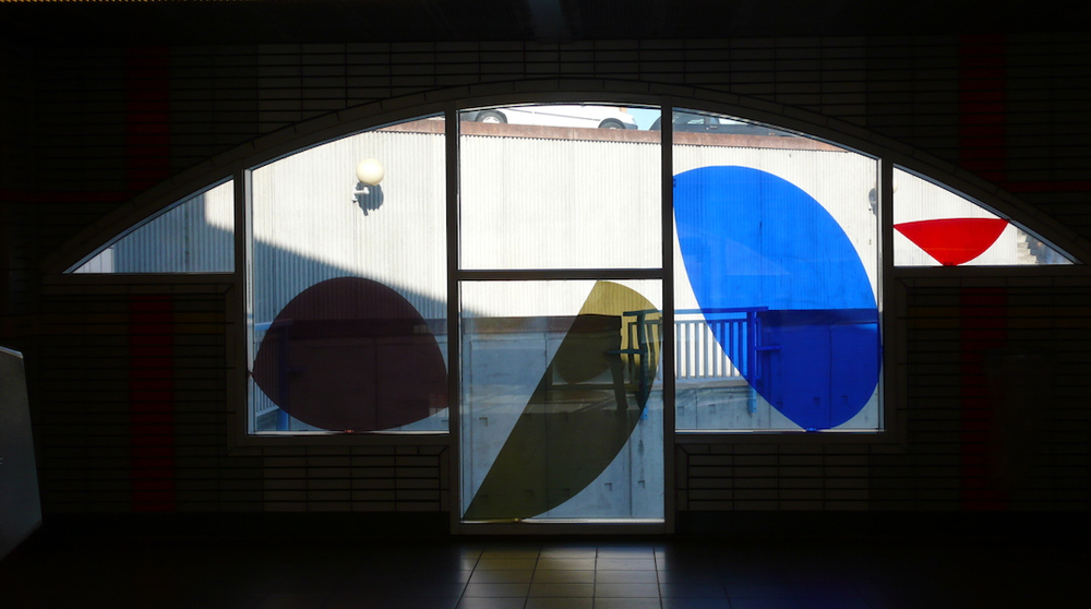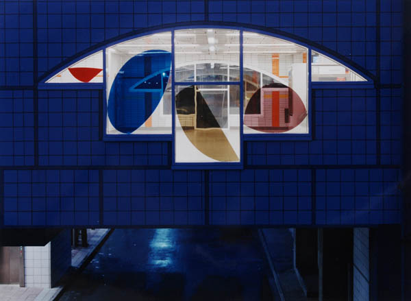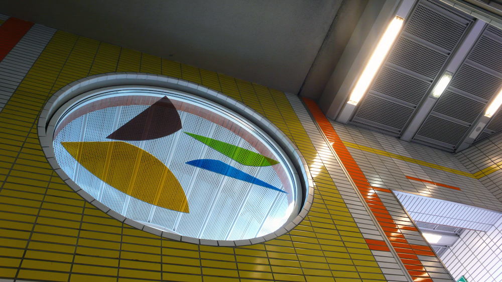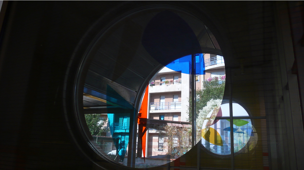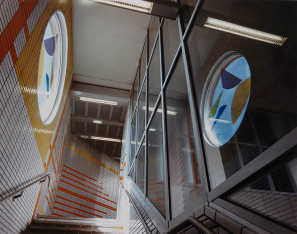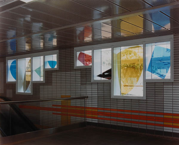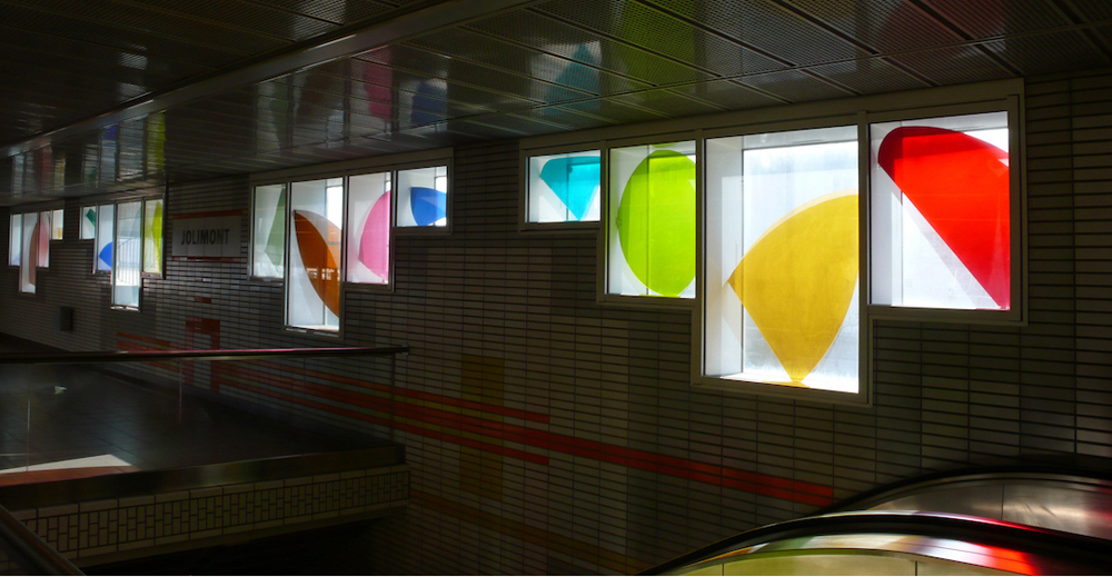 A commission to 15 artists, one work for each station of Toulouse’s first metro line. The Jolimont station comes out of a hill, it is in the open air. The work must be in relation to the glass openings. I respond to this request thinking that the vision through the windows must not be obscured, each passenger getting off the train must be able to find their way immediately, see the weather. Moreover, no photograph seems to me to be able to withstand the daily glances of tens of thousands of passengers without wearing out. I decide to place coloured glass in the space of the double windows, a sort of large pieces of a vanished image, of which only these fragments would remain, and whose shapes are similar to parts of stained glass windows. One coloured glass in each window. I program a computer, following rules that I set, but I also introduce randomness. With each click, it suggests a composition for a group of windows. If I like it, I print it out. Then I combine these choices to decide on the shapes and sizes of glass for each window. I choose the colours. 16 windows per platform, plus the two large rosettes, plus the two windows in the ticket hall. The glasses are made at Saint-Gobain, a bonding of two sheets of coloured glass, then a cut with a pressurised water jet is made according to the drawings. By day the glass is visible from the inside and by night it is visible from the outside. I was also asked to draw the two grids that close the accesses to the platform at the end of the station.