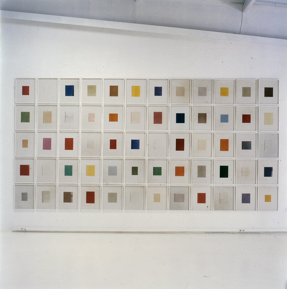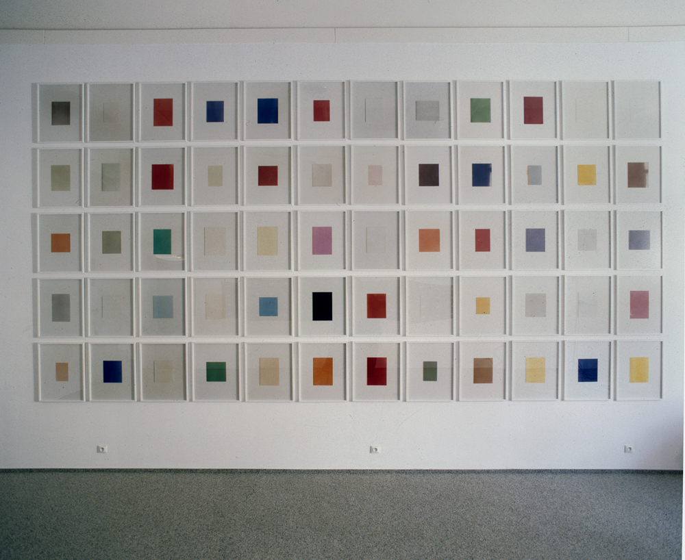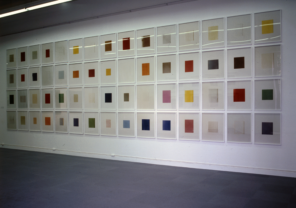 I collect art catalogues with anonymous covers, if possible, and photograph them with a 4x5" view camera. The piece consists of 60 photographs. For the installation, the frames are turned against the wall, one of them is taken and hung at the top left, the line of 15 is continued, the next one is taken, and the last one is placed in the bottom right corner. Each time it is presented, the piece will be different. The feeling for the photographer of coming after the presence of humans, the construction of cities, the production of objects, the manufacture of clothing, the creation of works of art.