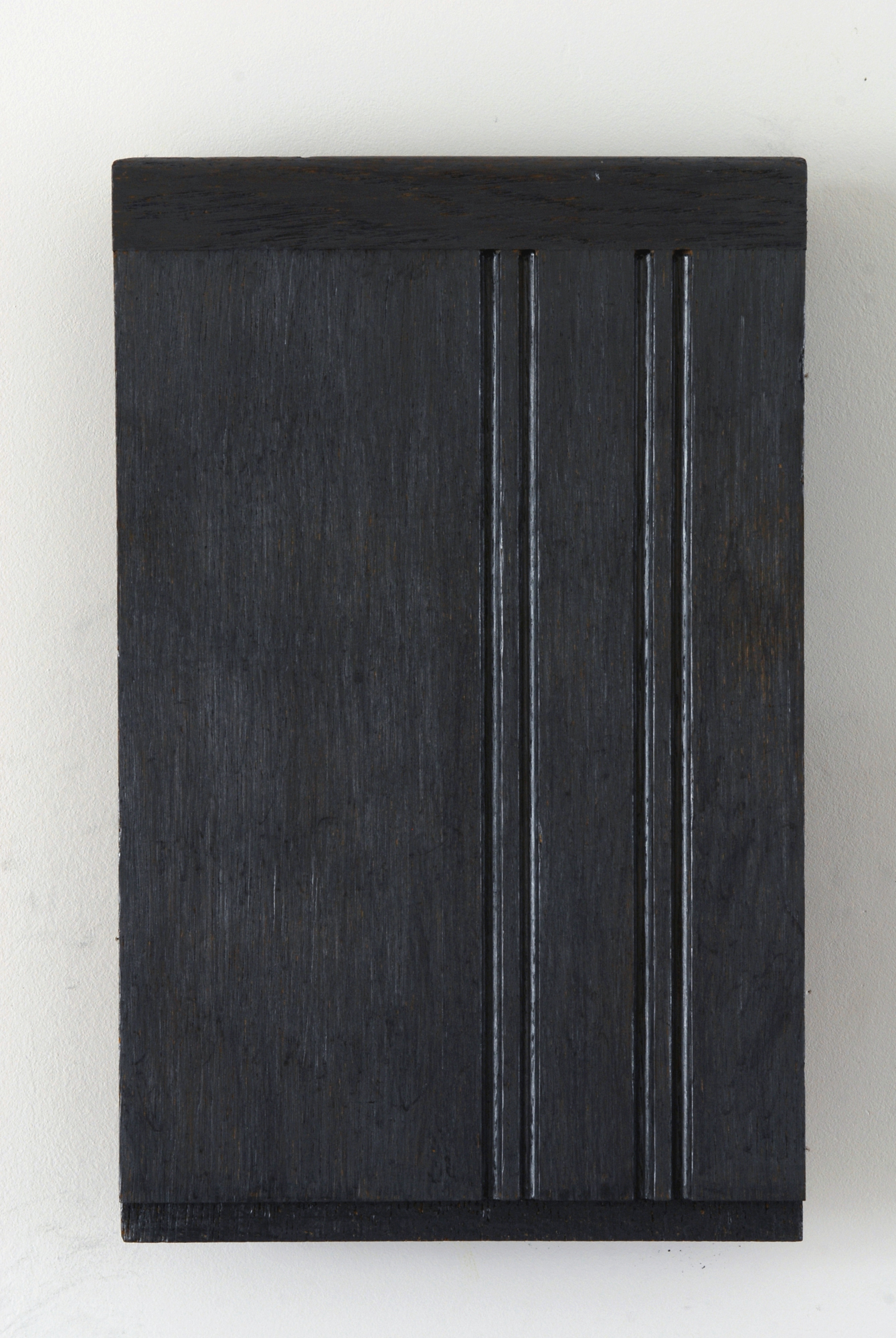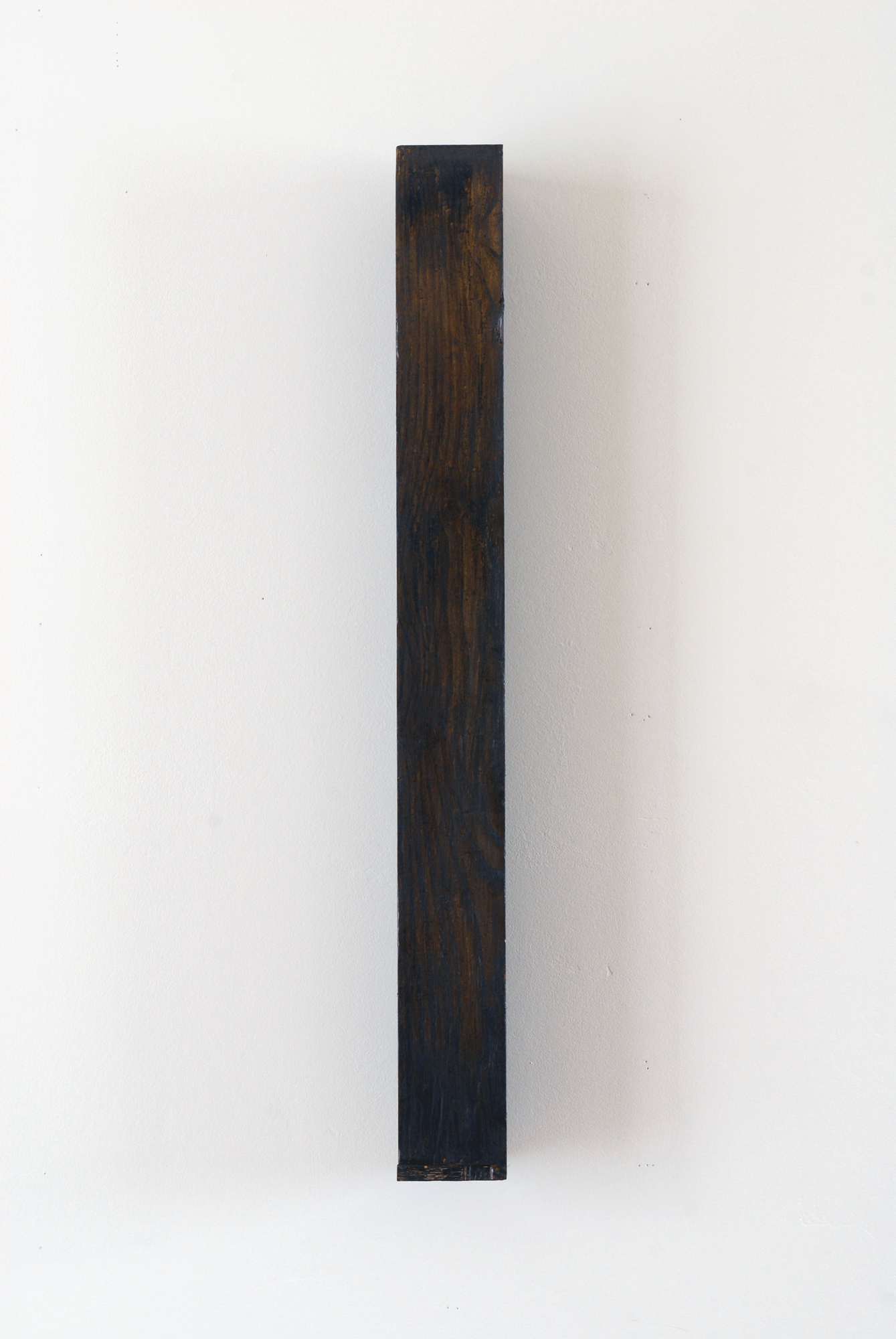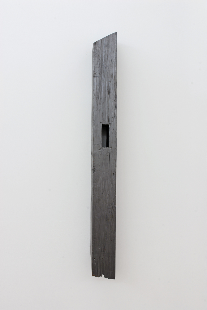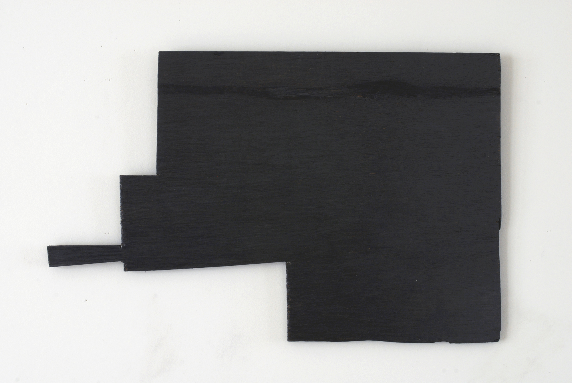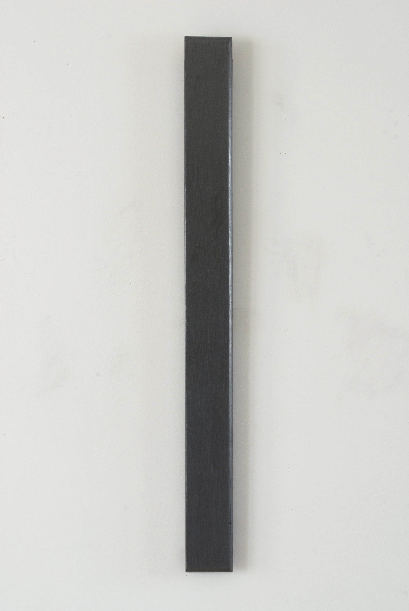 On the way from the flat to the studio, I pick up different things, and I begin to take an interest in used pieces of wood, whose original function is not very obvious. I am particularly careful in my choice of dimensions and shapes. After various experiments, I begin to cover the visible surface very completely with graphite. The wood is hidden under this grey layer, which is very sensitive to light reflections. The pieces of wood have a second life, saved in extremis from destruction, probably by fire. They are then hung on the wall, present in their erasure. I think that the gesture of covering the surface with graphite is similar to that of the photographer who unifies all the surfaces of matter present in reality, and which become, in the picture, the surface of photographic paper.