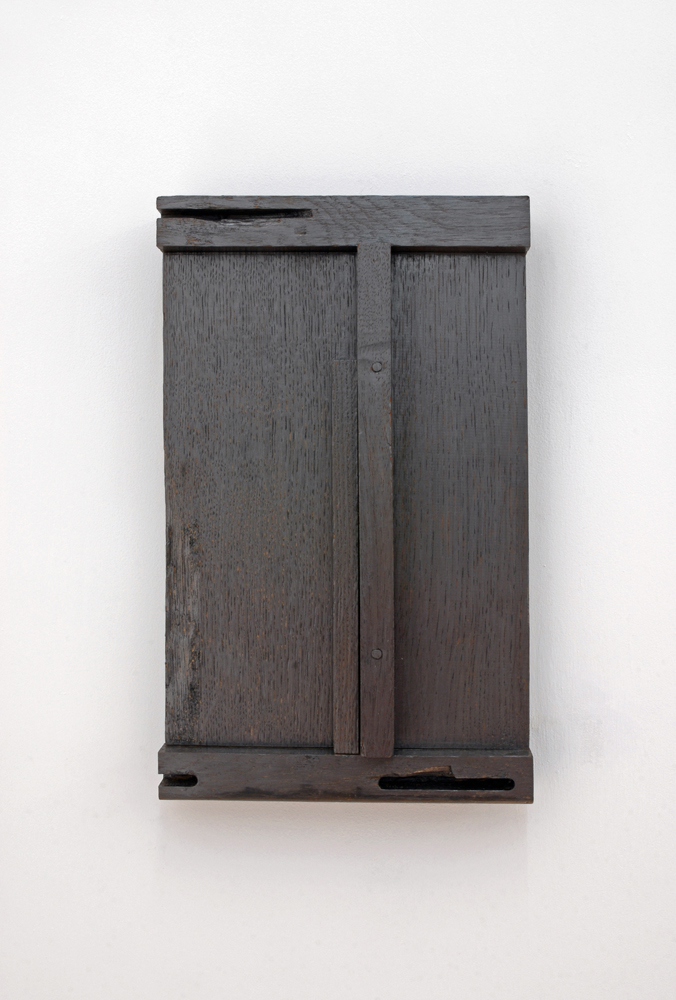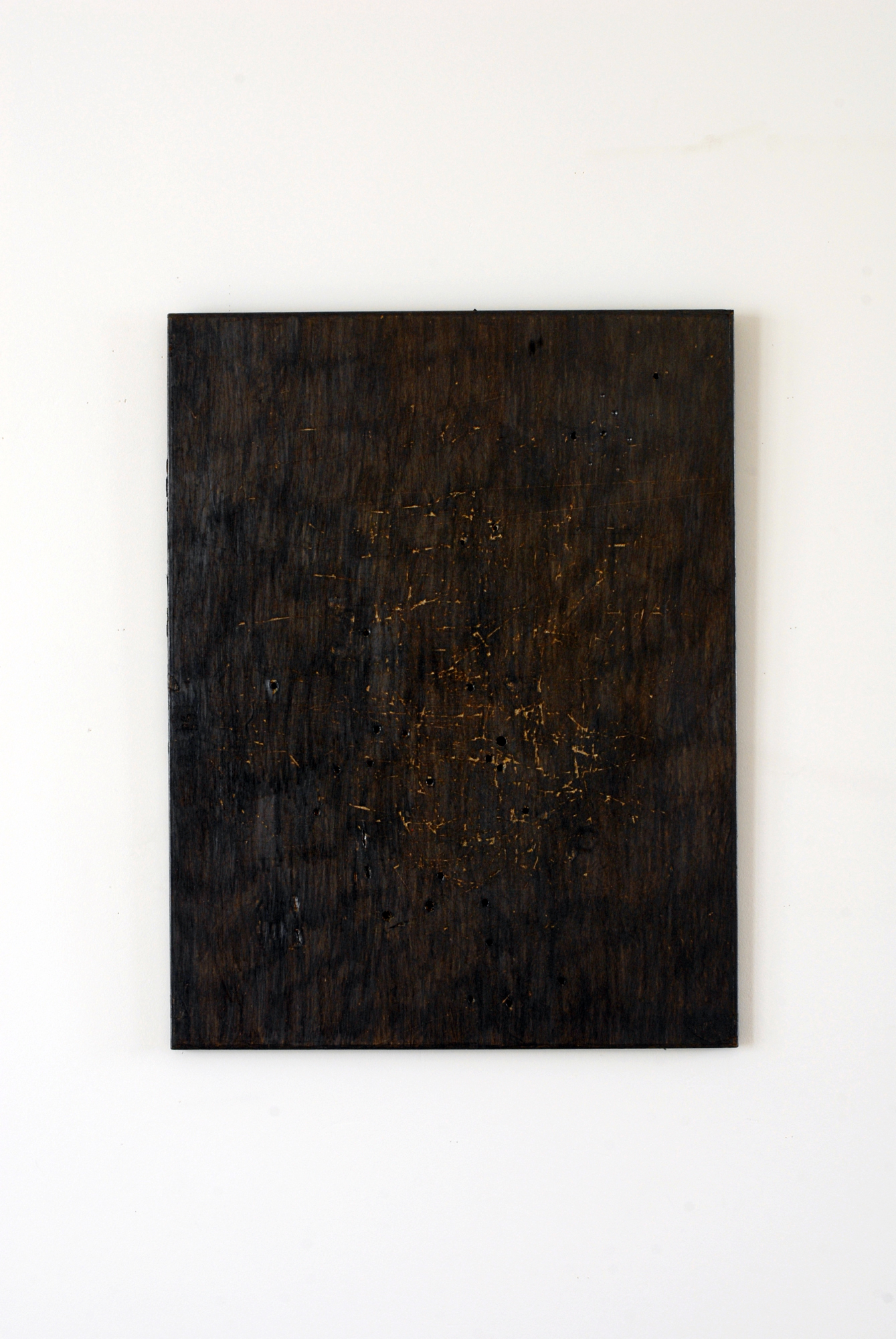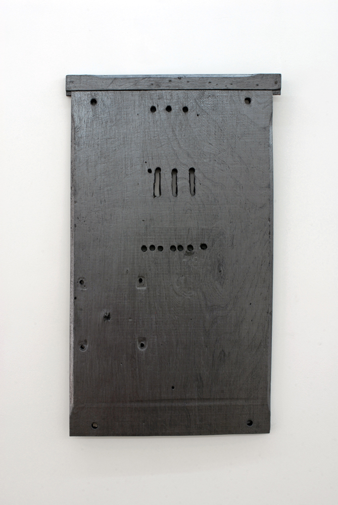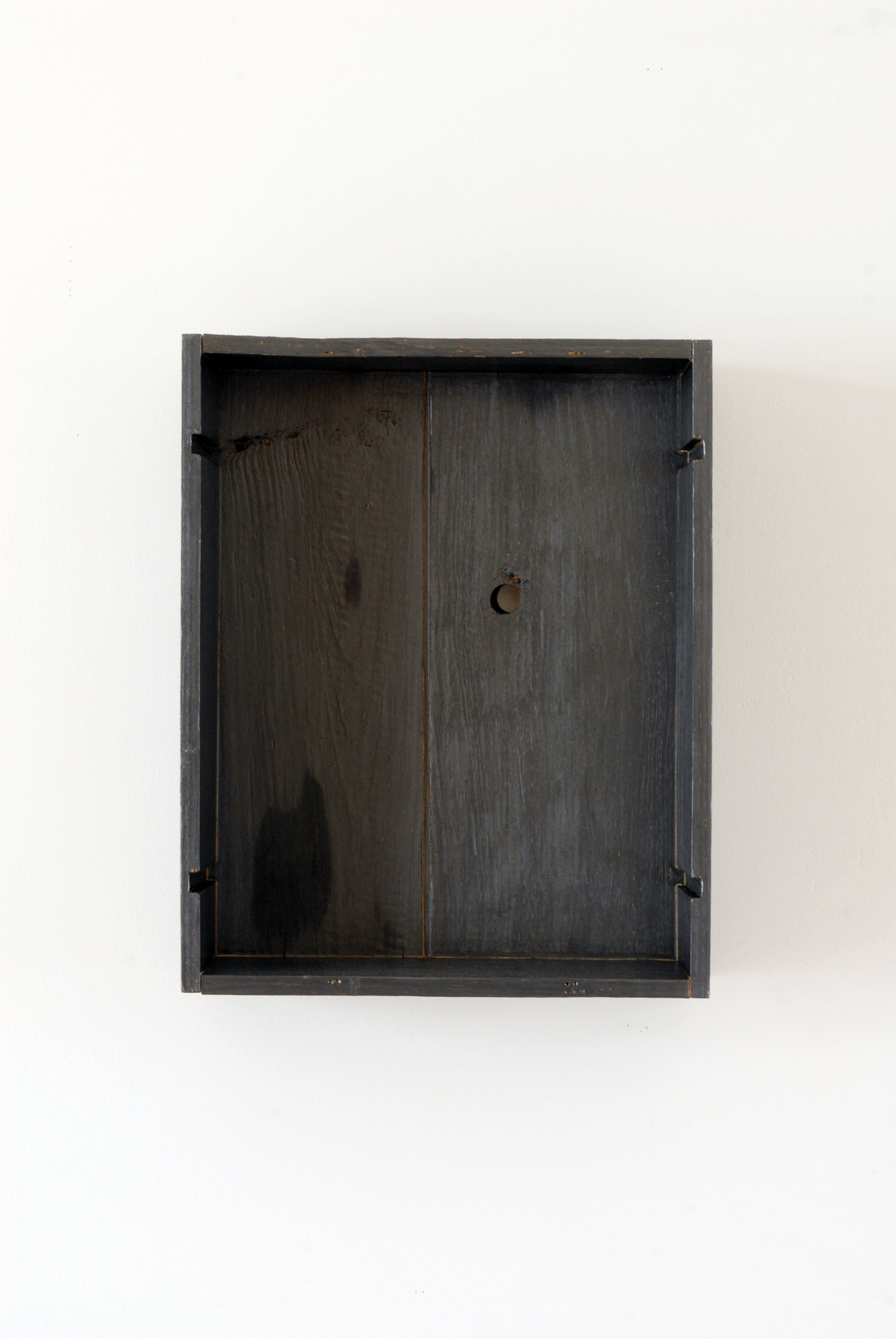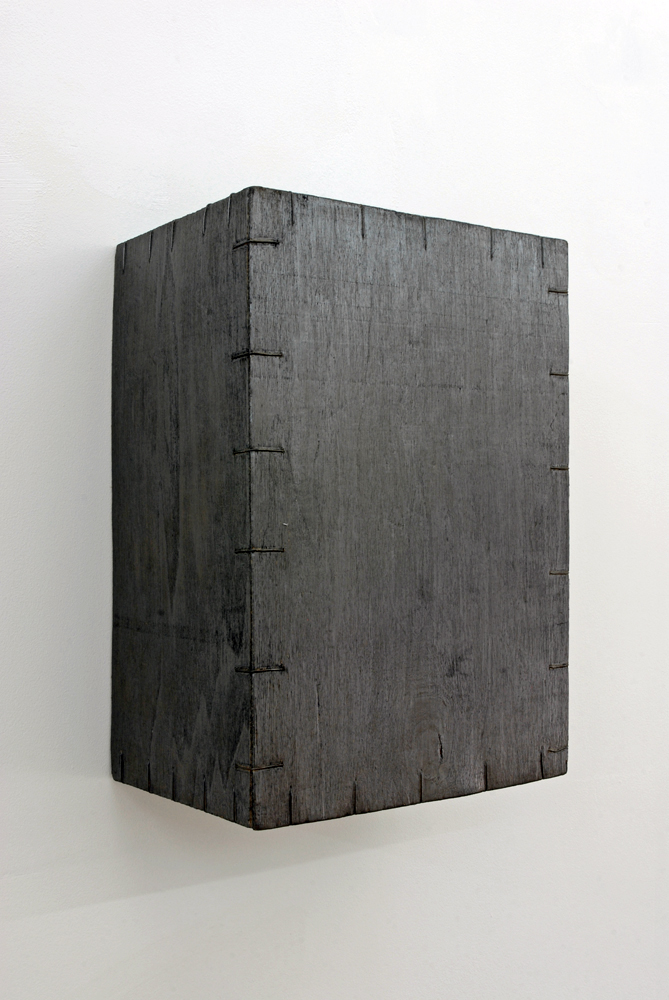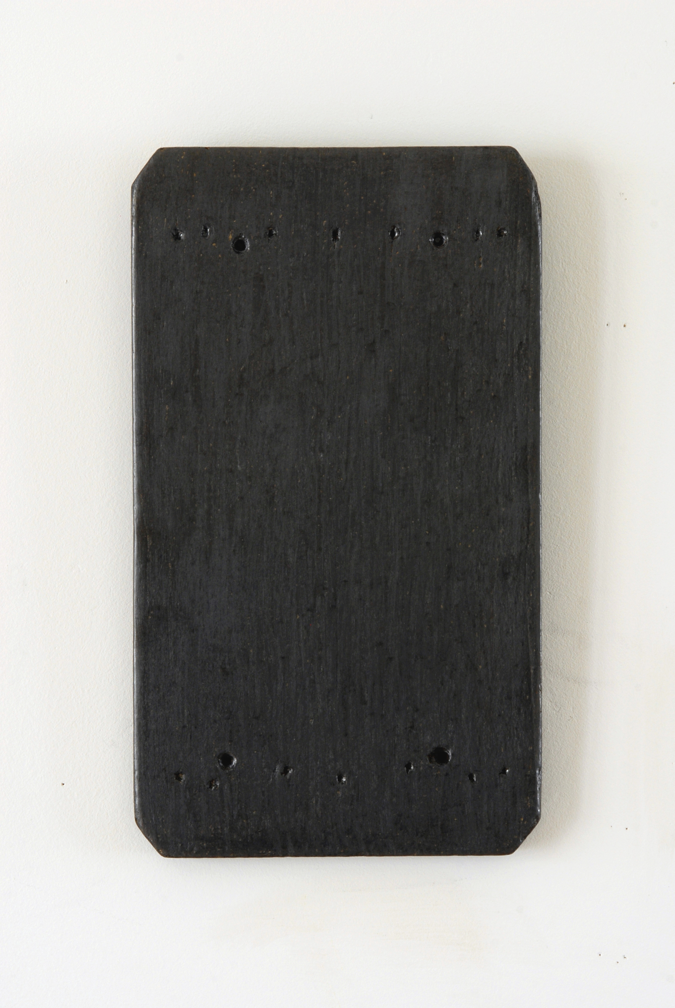 On the way from the flat to the studio, I pick up different things, and I begin to take an interest in used pieces of wood, whose original function is not very obvious. I am particularly careful in my choice of dimensions and shapes. After various experiments, I begin to cover the visible surface very completely with graphite. The wood is hidden under this grey layer, which is very sensitive to light reflections. The pieces of wood have a second life, saved in extremis from destruction, probably by fire. They are then hung on the wall, present in their erasure. I think that the gesture of covering the surface with graphite is similar to that of the photographer who unifies all the surfaces of matter present in reality, and which become, in the picture, the surface of photographic paper.