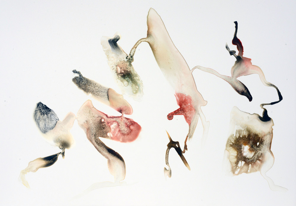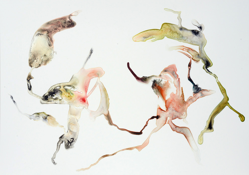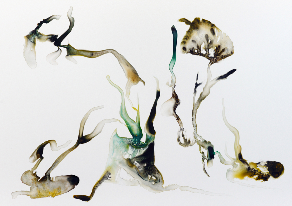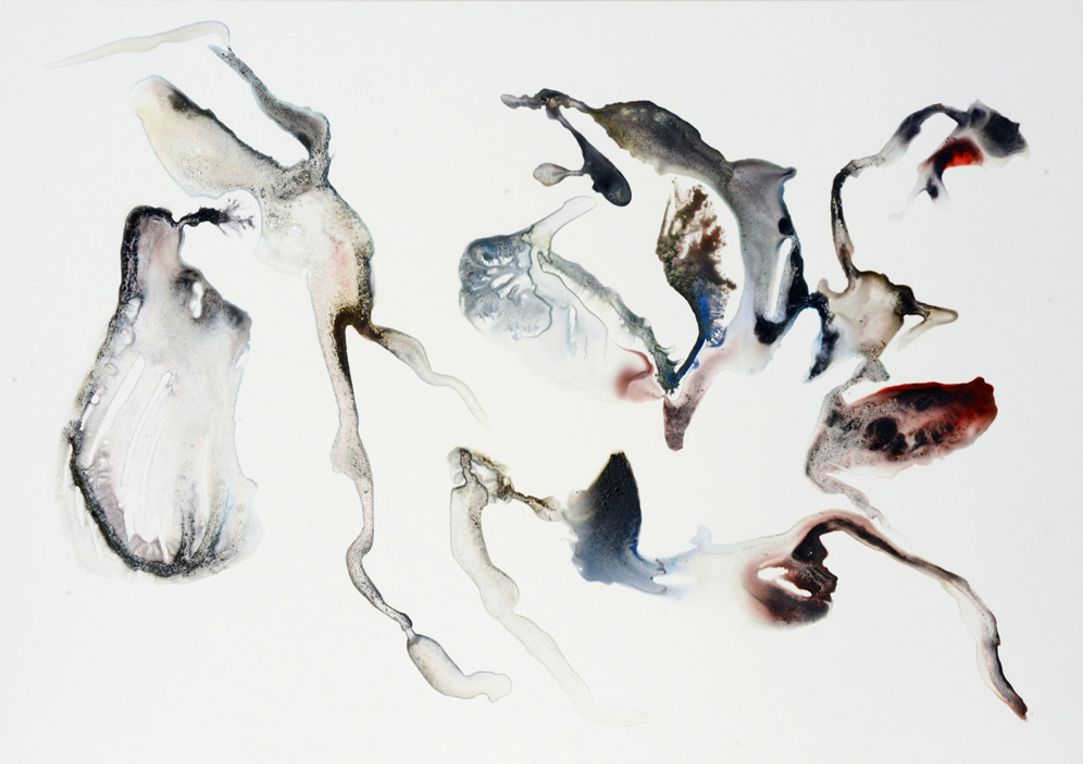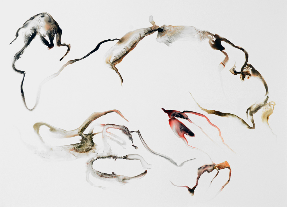 Depuis maintenant près de cinq ans, j’ai mis en place une pratique régulière de dessin. Ils sont datés, archivés soigneusement, plusieurs centaines aujourd’hui. Les dessins sont des phénomènes physiques qui se déroulent sur la feuille de papier, théâtre des opérations. Coulées, contacts, diffusions, captations, échanges mutuels de matière, rencontres, oppositions, distances, tensions, fusions. Toute une vie en action, à un stade élémentaire ou métaphorique. Entre le fait et le non fait, entre ce qui est décisions et conséquence non contrôlable de ces décisions. Peut-être tentent ils de dire le fond de ma pensée, de mes sensations, quelque chose qui vit, mélange fusionnel de contraintes et de liberté, d’aléatoire et de nécessaire. Un échange perpétuel de substances organiques et minérales qui est le propre de la vie. Et nous un très court instant dans ce continuum, le temps de faire et de laisser quelques traces qui l’expriment. Le mouvement est perceptible dans ces ensembles de formes et il semble figé en une fraction de seconde, comme dans une photographie.