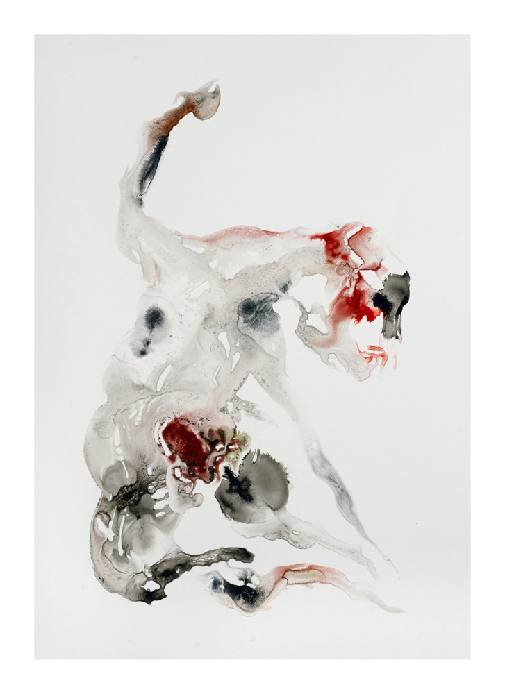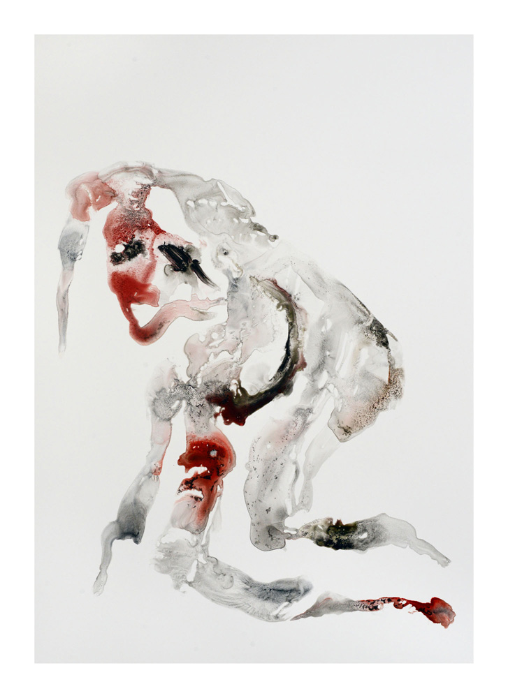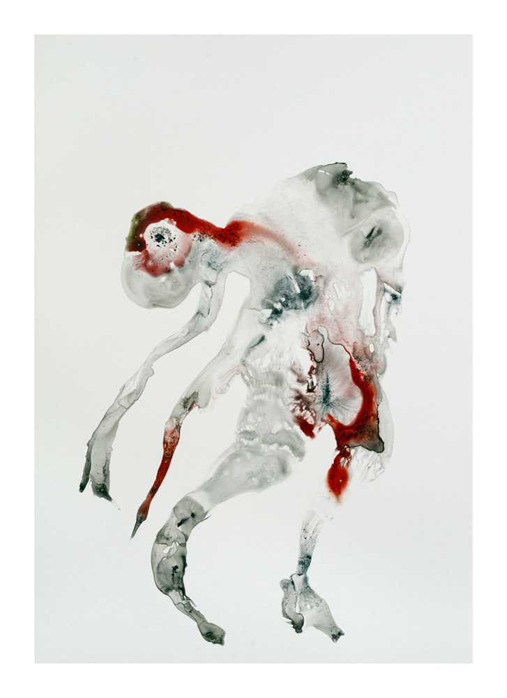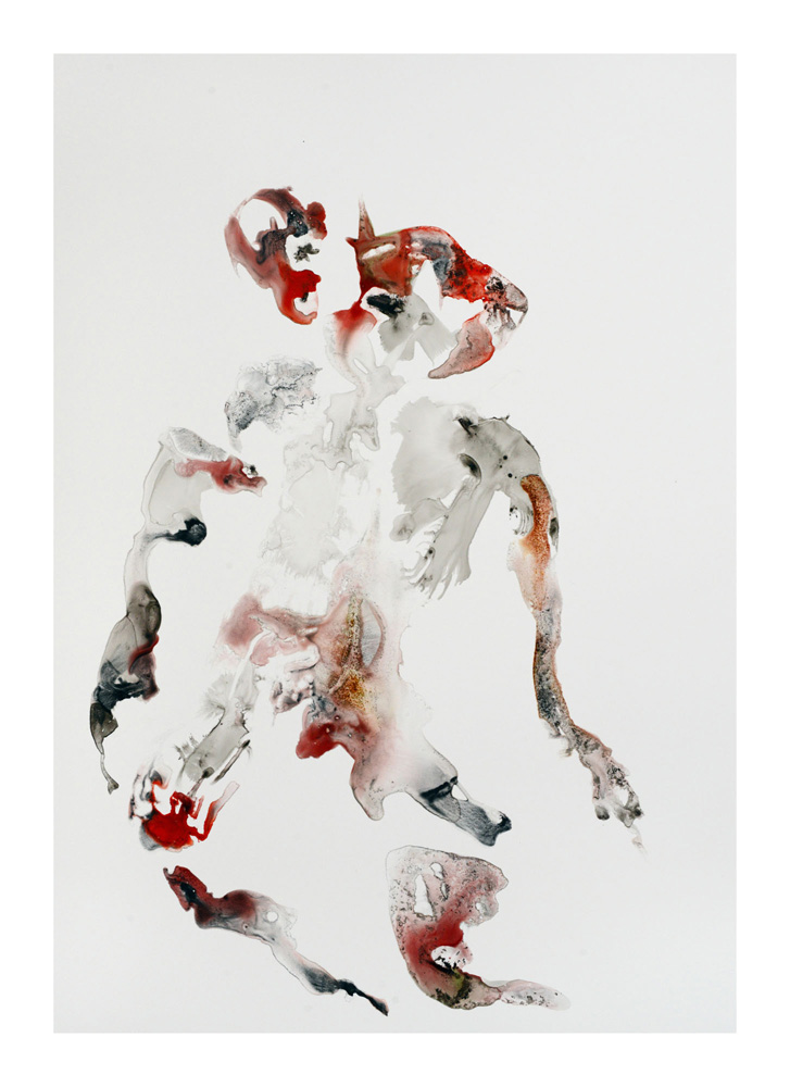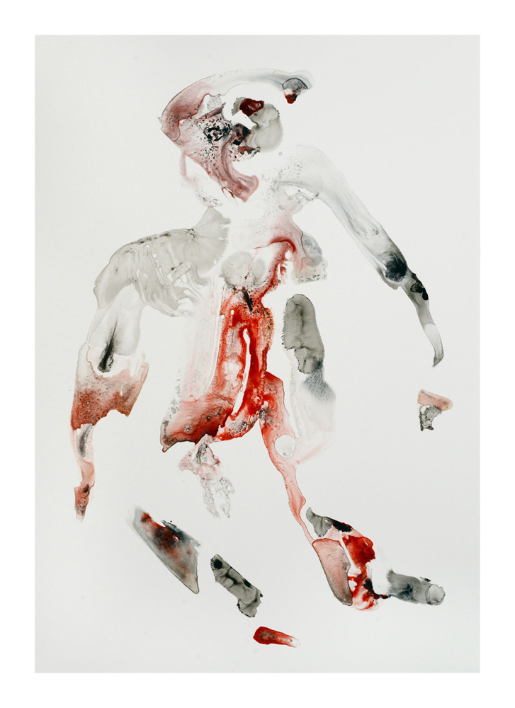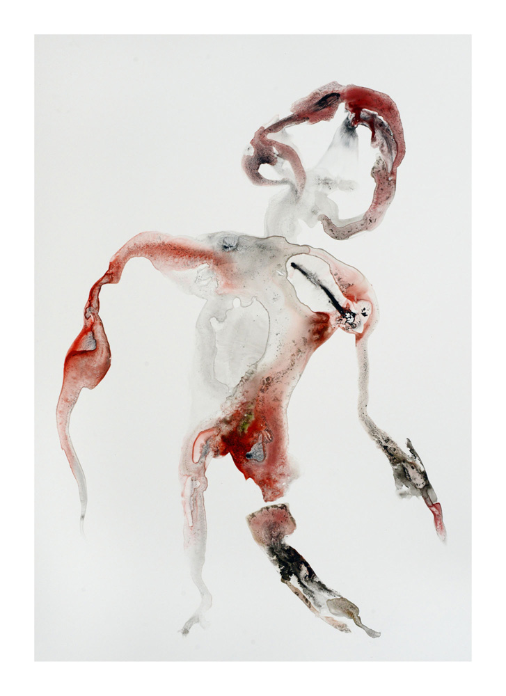 Un premier personnage humanoïde fragile aux multiples blessures intérieures est apparu en Bretagne lors de la séance de dessin du 23 juillet. Une sorte d’autoportrait, je pensais. Il est resté unique, je l’ai encadré et mis au mur un moment ici. L’attaque terrible du Hamas du 7 octobre et la violence épouvantable de la réaction israélienne à Gaza a réveillé notre sensation de fragilité intérieure. Et ce ajouté à la guerre toujours en cours en Ukraine et aux autres divers conflits actuels. Les personnages sont réapparus à la suite de ces événements, la série s’est poursuivie. Je les ai tous gardés, sans aucune sélection et rangés dans l’ordre de leur réalisation. Un personnage solitaire dans un espace blanc flotte, il tient à peine debout, tente quelques derniers pas avant de s’écrouler, ou il est saisi dans la chute, ou est encore une masse sur le sol. Il fait parfois des gestes démonstratifs, des appels à l’aide adressés à on ne sait qui, ses membres peuvent être disloqués, et sur tous, les zones colorées où les rouges dominent, suggèrent de nombreuses blessures graves et souvent sans doute fatales. Si nous ne sommes pas les victimes directes de ces crimes, nous sommes atteints et blessés dans notre humanité par la terrible violence exercée sur des humains, par des humains. Ces dessins expriment, montrent, entre réalité et métaphore, cet état dans lequel nous sommes plongés. En plein désarroi.