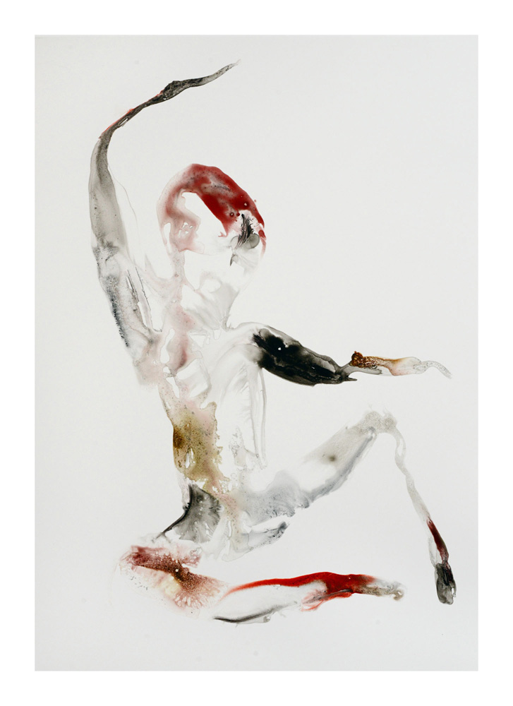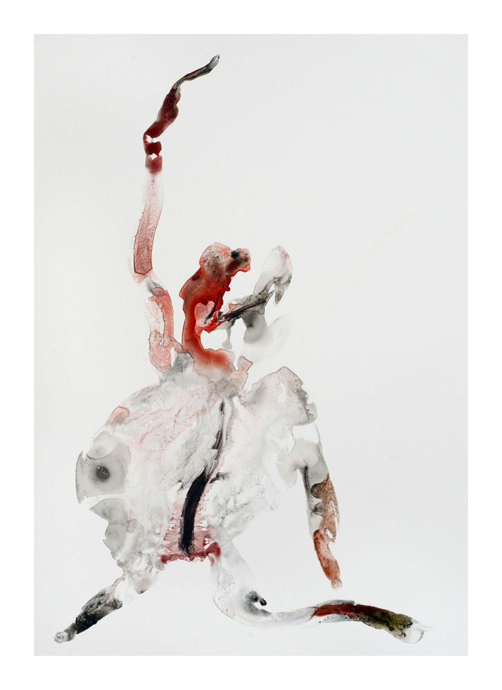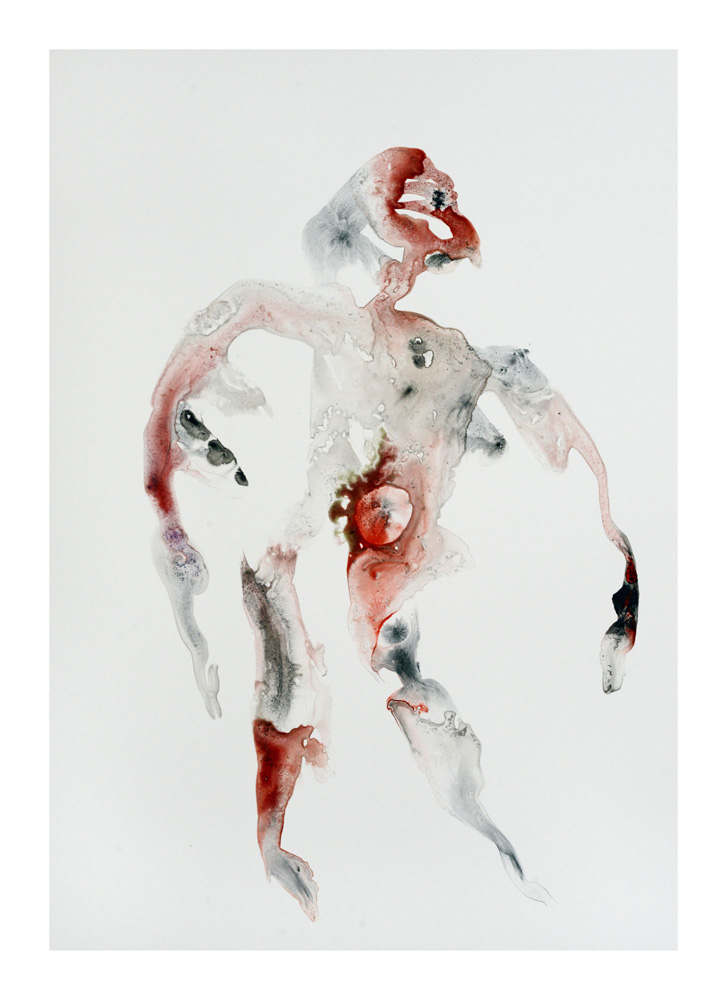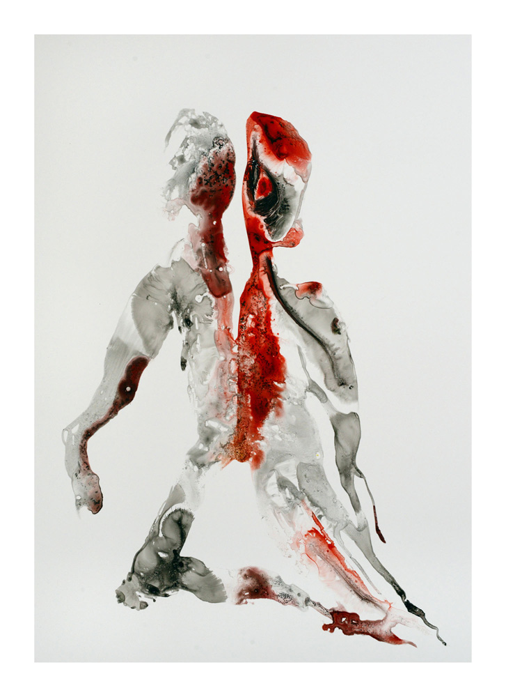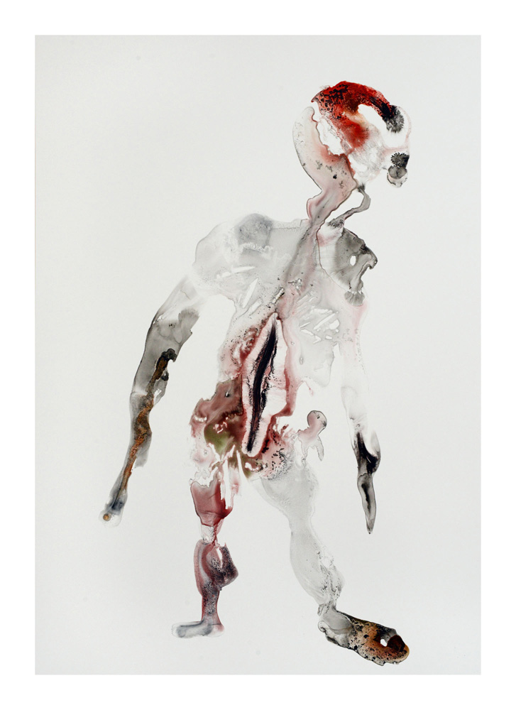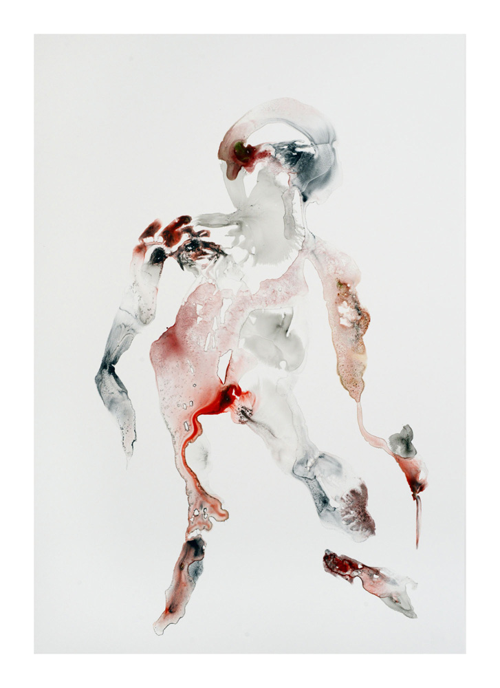 Un premier personnage humanoïde fragile aux multiples blessures intérieures est apparu en Bretagne lors de la séance de dessin du 23 juillet. Une sorte d’autoportrait, je pensais. Il est resté unique, je l’ai encadré et mis au mur un moment ici. L’attaque terrible du Hamas du 7 octobre et la violence épouvantable de la réaction israélienne à Gaza a réveillé notre sensation de fragilité intérieure. Et ce ajouté à la guerre toujours en cours en Ukraine et aux autres divers conflits actuels. Les personnages sont réapparus à la suite de ces événements, la série s’est poursuivie. Je les ai tous gardés, sans aucune sélection et rangés dans l’ordre de leur réalisation. Un personnage solitaire dans un espace blanc flotte, il tient à peine debout, tente quelques derniers pas avant de s’écrouler, ou il est saisi dans la chute, ou est encore une masse sur le sol. Il fait parfois des gestes démonstratifs, des appels à l’aide adressés à on ne sait qui, ses membres peuvent être disloqués, et sur tous, les zones colorées où les rouges dominent, suggèrent de nombreuses blessures graves et souvent sans doute fatales. Si nous ne sommes pas les victimes directes de ces crimes, nous sommes atteints et blessés dans notre humanité par la terrible violence exercée sur des humains, par des humains. Ces dessins expriment, montrent, entre réalité et métaphore, cet état dans lequel nous sommes plongés. En plein désarroi.
