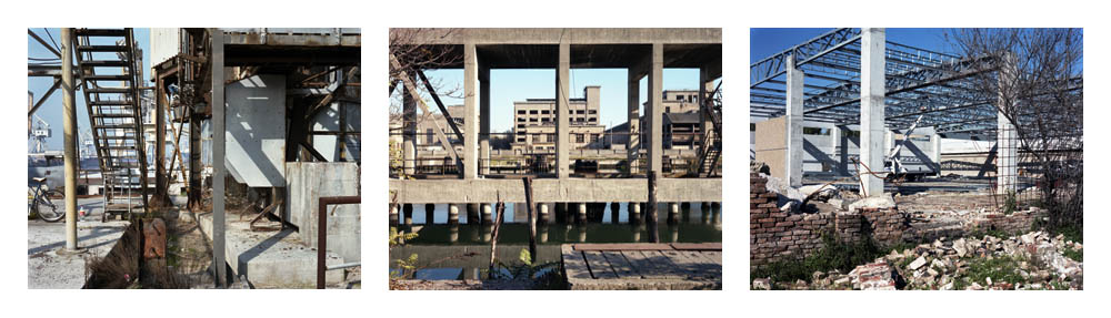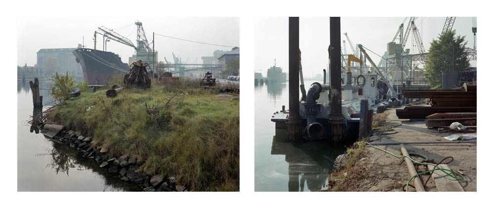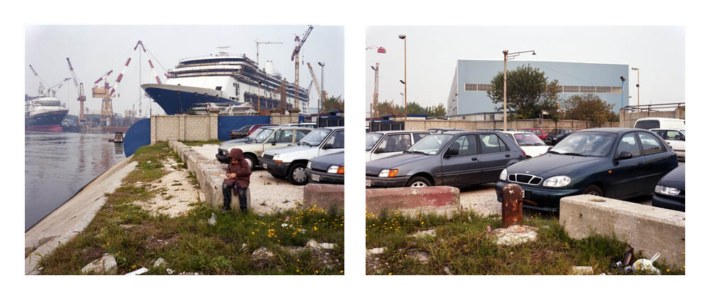 Pas d’autorisations, l’espace public, le plus libre me convient. Plusieurs paysages recomposés de photographies prises en des lieux différents et un diptyque avec un enfant. Dans cet espace ou les hommes ont détruit toute beauté, l’eau est huileuse, les déchets s’éparpillent dans les herbes maigres, l’air sent les poussières industrielles, les sons des ferrailles déversées sur un quai agressent, l’enfant prend un morceau de brique et dessine sur une pierre un bateau. Il a la ressource de se créer un monde, là ou nous sommes anéantis.