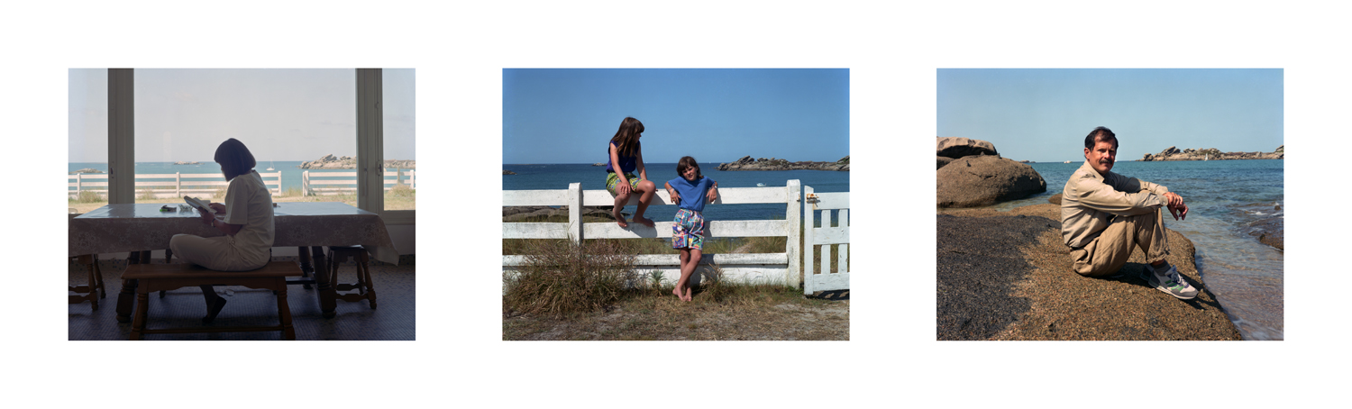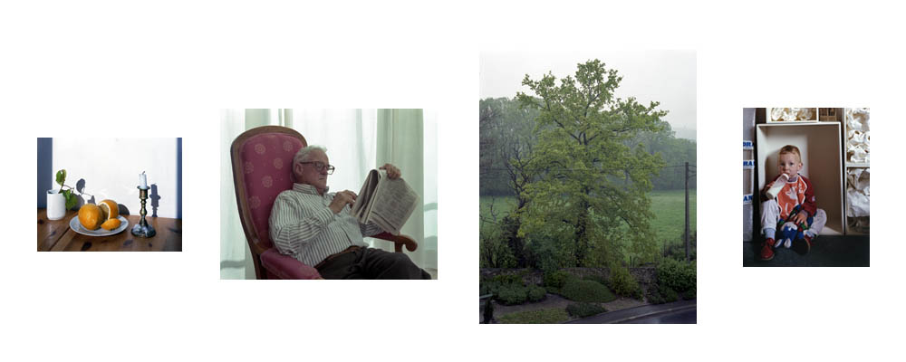 J’ai commencé à composer ces suites de 5 photographies, pas plus, les percevoir comme un tout devenait trop difficile avec un nombre supérieur d’images. Ce n’est pas un journal de notre vie, c’est une utilisation du proche pour parler du passage de la vie à l’oeuvre. Le moment de la prise de vue photographique est le point de basculement de l’instant de la vie dans le temps de l’oeuvre, si du moins cette photographie se trouve ultérieurement faire partie de l’oeuvre. Le photographe éprouve à chaque déclenchement ce vertige mélancolique, point de basculement de l’instant présent dans le temps futur. Ces suites écrivent cette situation. La composition de chacune d’entre elles établit des liens entre les sujets, les couleurs, les tailles des photographies, pour la rendre autonome et perceptible au premier coup d’oeil comme un tout et non comme une suite d’images indépendantes. Cette lecture qui est devenue évidente une dizaine d’années après leur réalisation, ne l’était pas du tout lors de leur première exposition.