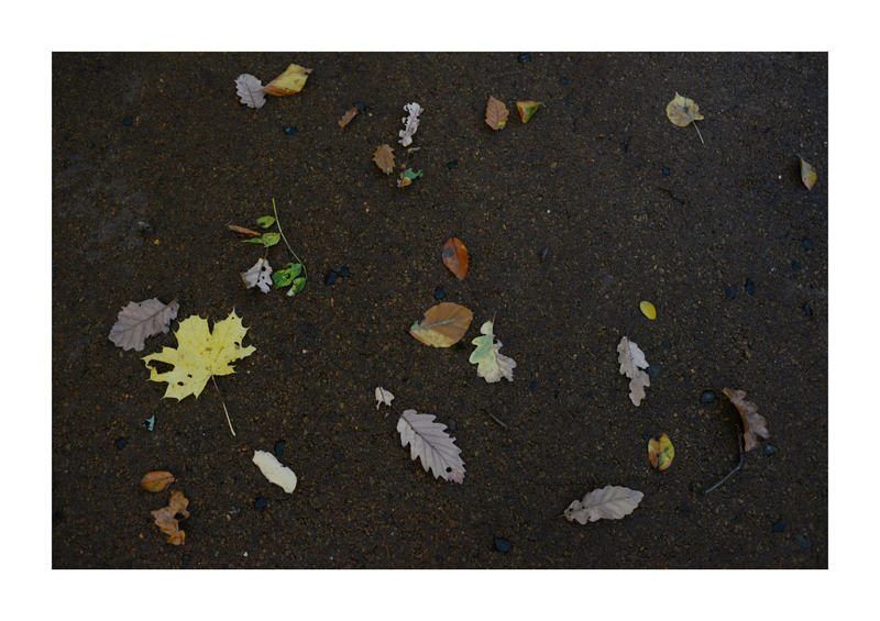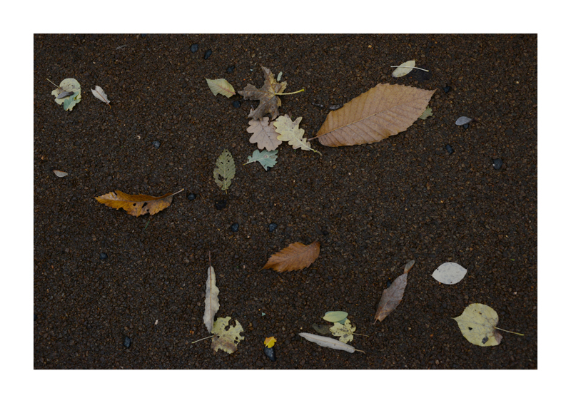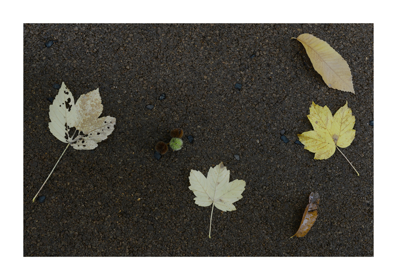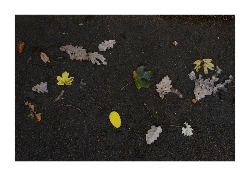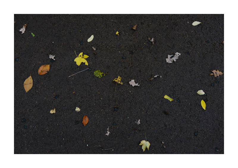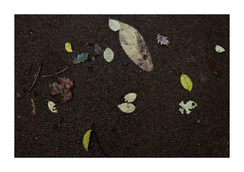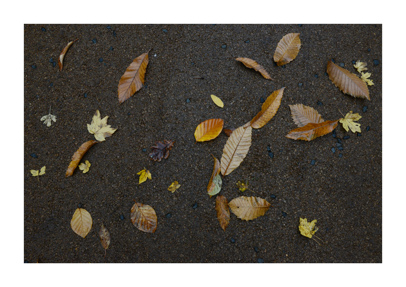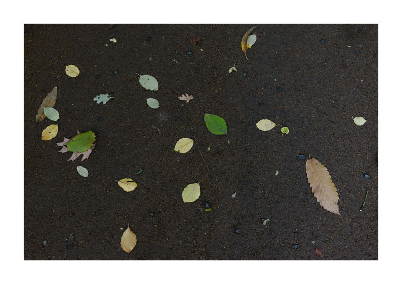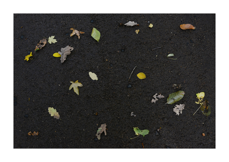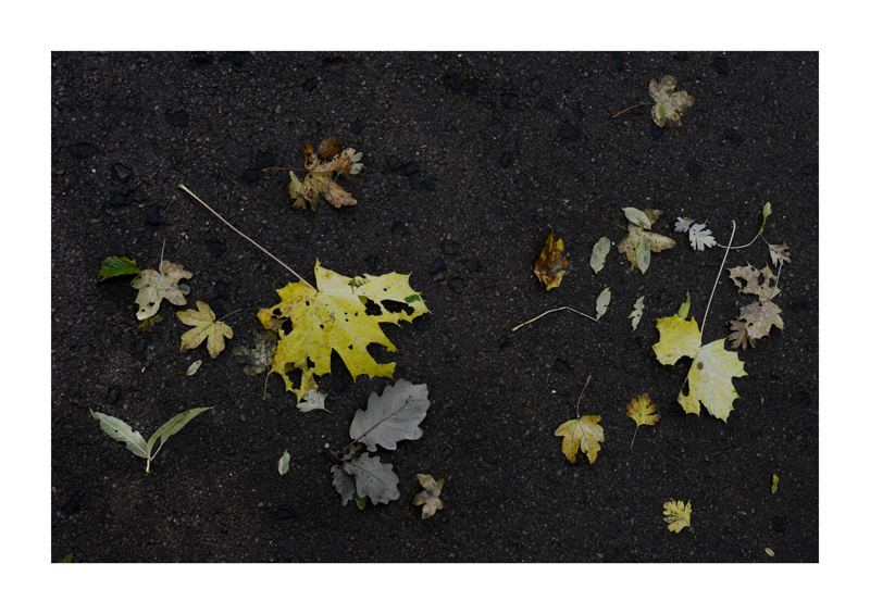 Je regarde la sélection des photographies des feuilles sur les sols faites ces derniers jours. Une dispersion au gré des circonstances, démocratique, chaque élément à sa place et importance dans la composition. La perspective est abolie dans ce plan frontal du sol, le regard est incité à se déplacer continuellement d’un élément à un autre. Comme dans mes dessins ou dans d’autres séries de photographies, je pense aux Désordres par exemple. Je recueille sans doute ici l’expérience de la composition sur une feuille de papier. Nature contrariée par le macadam des hommes, sa beauté miraculeuse sur cette surface non réceptive, uniforme et stérile dans son refus d’intégrer le cycle de dégradation vivant de ces feuilles. La pesanteur et la grâce, et le macadam. Images faites dans l’environnement proche, pas de déplacements particulier, bilan carbone, l’obsession du moment, réduit à la subsistance. Le monde va mal, la crise climatique, la guerre, la famine et tous les autres malheurs de ce monde nous sont chaque jour rappelés et nous accablent, cependant l’automne arrive, les feuilles tombent, je mange, je vis, je passe du temps à chercher ces images que je sélectionne avec le plus grand soin. Dérisoire? Wozu Dichter in dürftiger Zeit?