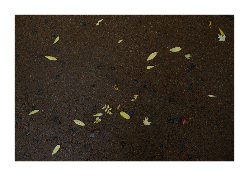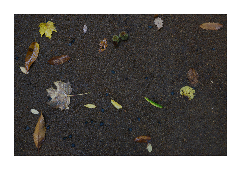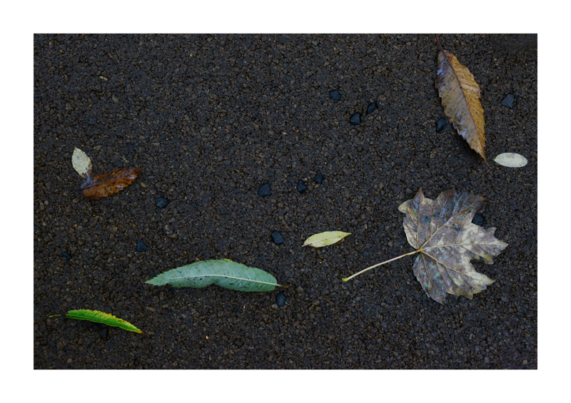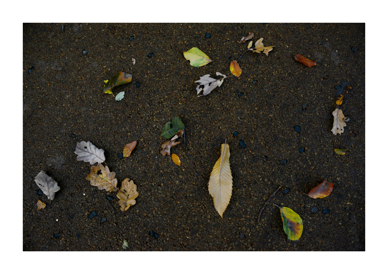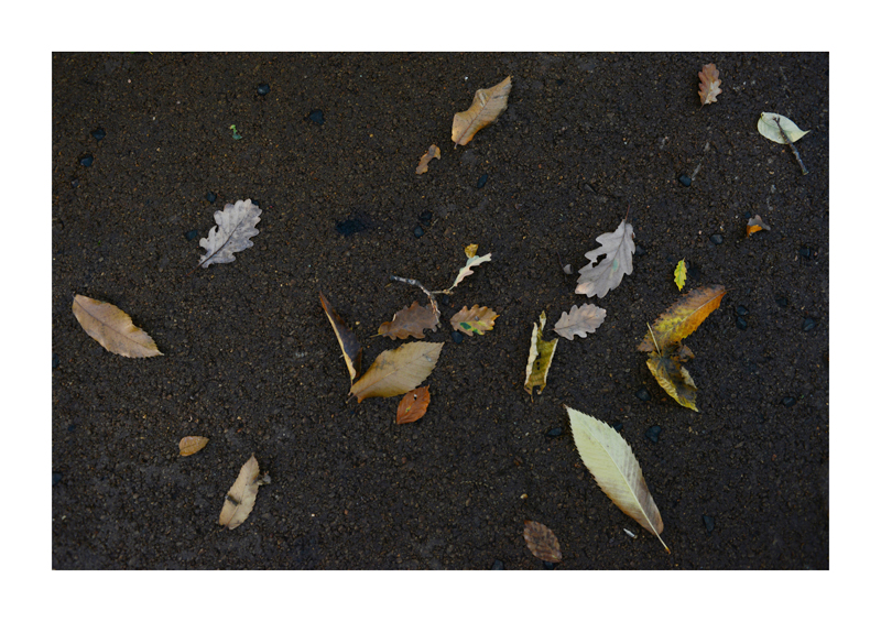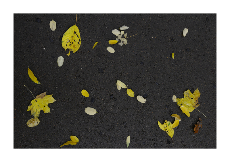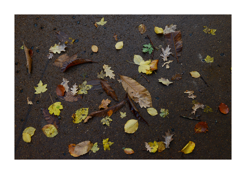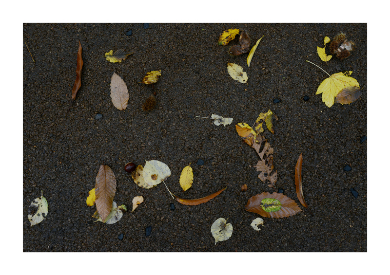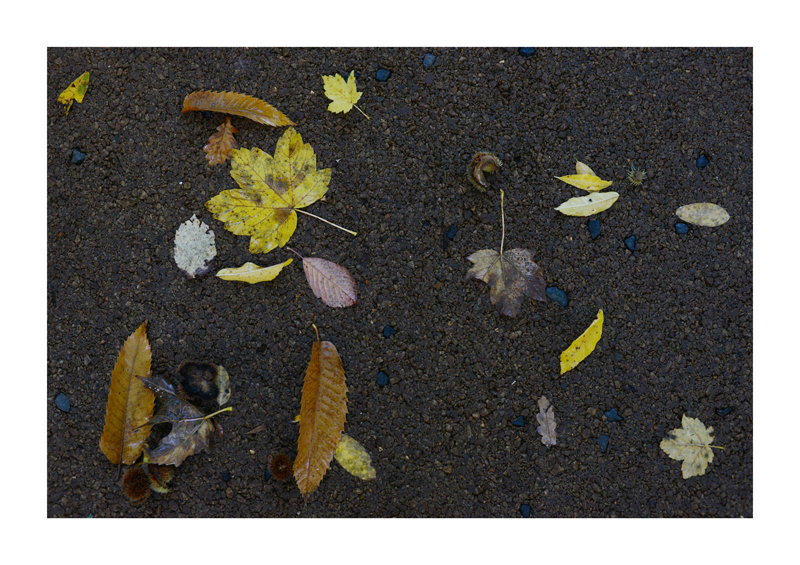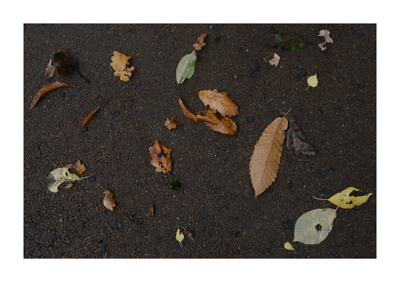 Je regarde la sélection des photographies des feuilles sur les sols faites ces derniers jours. Une dispersion au gré des circonstances, démocratique, chaque élément à sa place et importance dans la composition. La perspective est abolie dans ce plan frontal du sol, le regard est incité à se déplacer continuellement d’un élément à un autre. Comme dans mes dessins ou dans d’autres séries de photographies, je pense aux Désordres par exemple. Je recueille sans doute ici l’expérience de la composition sur une feuille de papier. Nature contrariée par le macadam des hommes, sa beauté miraculeuse sur cette surface non réceptive, uniforme et stérile dans son refus d’intégrer le cycle de dégradation vivant de ces feuilles. La pesanteur et la grâce, et le macadam. Images faites dans l’environnement proche, pas de déplacements particulier, bilan carbone, l’obsession du moment, réduit à la subsistance. Le monde va mal, la crise climatique, la guerre, la famine et tous les autres malheurs de ce monde nous sont chaque jour rappelés et nous accablent, cependant l’automne arrive, les feuilles tombent, je mange, je vis, je passe du temps à chercher ces images que je sélectionne avec le plus grand soin. Dérisoire? Wozu Dichter in dürftiger Zeit?
