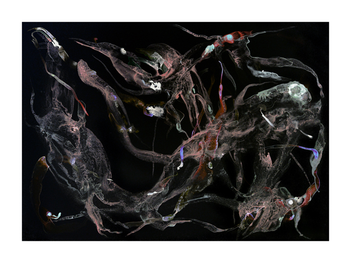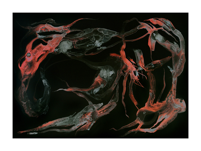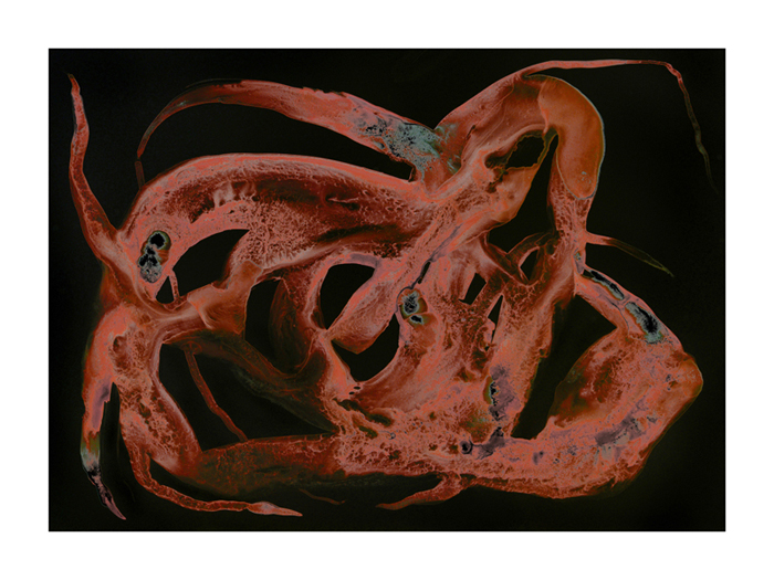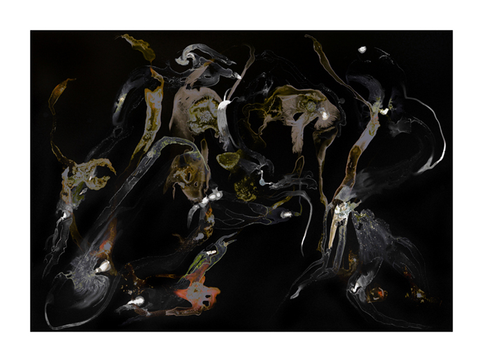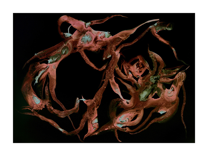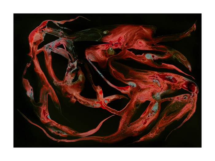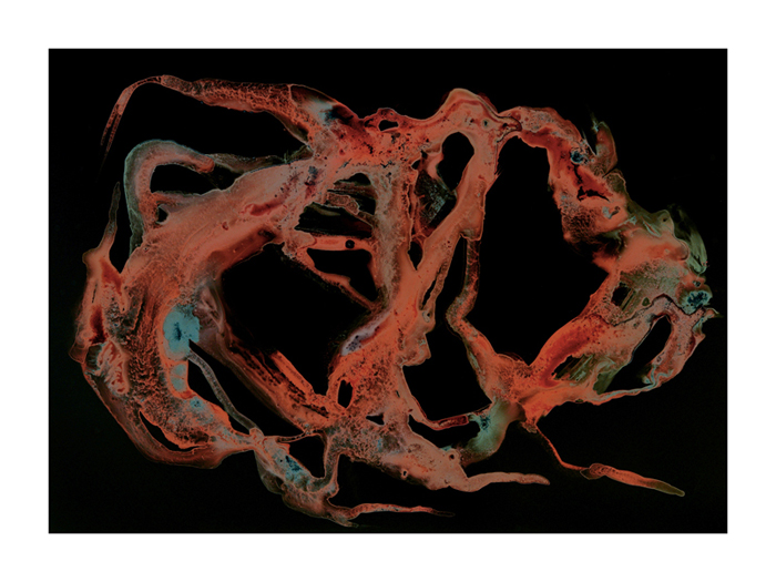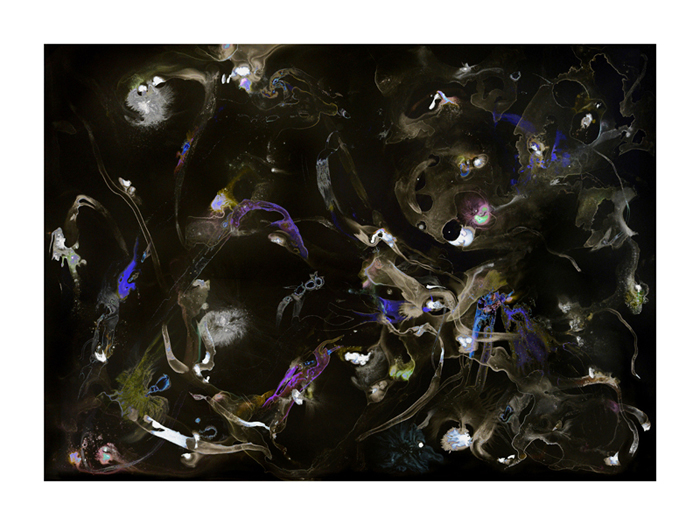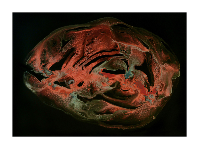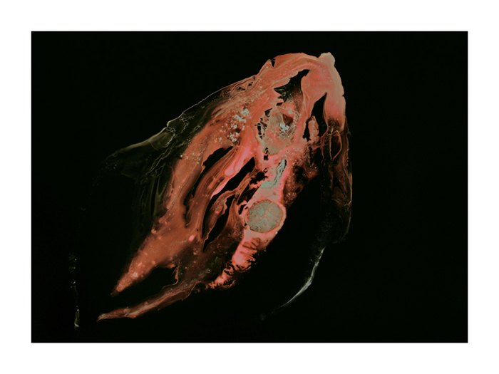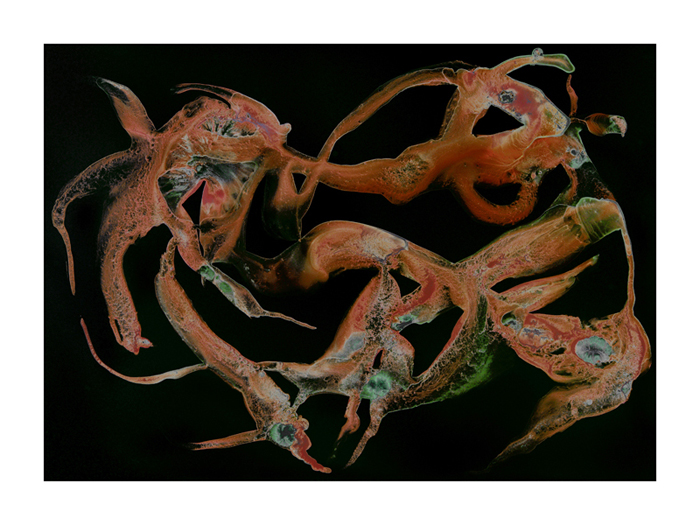 Sous ce nom de code se dévoilent 11 images inconnues, qui viennent d’être achevées dans un laboratoire tenu secret. Même en les regardant attentivement, leur origine est si incertaine qu’il est presque impossible de savoir comment elles ont été faites. Elles sont là plutôt douces dans leur présence. La ou les matières qui les constituent restent impossibles à définir, sont elles naturelles mais de quelle nature parlerait-on alors? Ou résultats de combinaisons sophistiquées de la chimie industrielle qui aurait concocté des tissus organiques et synthétiques aussi précis qu’improbables? Elles ne peuvent pas avoir été faites ou peintes à la main tant les détails des textures sont précis, et leur surface lisse et parfaite avoue une provenance technique certaine. On pourrait ici faire l’hypothèse que ce sont des photographies, mais quelle en serait l’origine nécessairement dans le réel pour toute photographie? Ou penser que ce sont des images de synthèses, totalement faites par ordinateur, mais alors cette précision des matières nous en dissuaderait encore, non ce n’est pas possible. Alors reste une dernière possibilité, elles seraient tout cela à la fois, une intime fusion de matérialité réelle et de processus numériques. Vivantes et mortes, animales et artificielles, trouvées et fabriquées, leur ambivalence résiste à toute classification. Ce sont des images résolument contemporaines, issues de notre réalité combinant l’organique du monde où nous vivons et la virtualité du numérique toujours plus envahissante. Nous sommes devant elles face à un dilemme que nous ne pouvons trancher, invités à partager leur mystère, qui est aussi celui de notre vie présente.